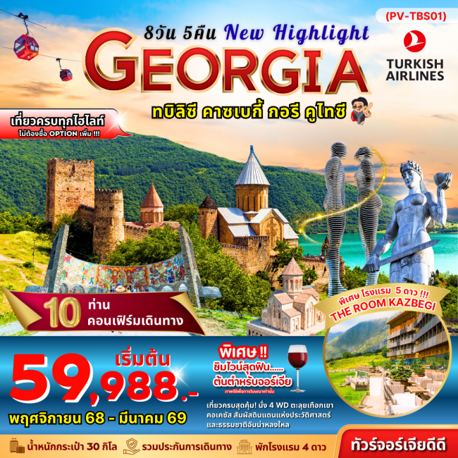 บ้านฮอลิเดย์ทราเวลเรามี แพ็คเกจทัวร์จอร์เจียครบทุกเส้นทาง พร้อมบริการไกด์มืออาชีพ ราคาคุ้มค่า เที่ยวจริง บินแน่นอน ทุกโปรแกรมถูกออกแบบให้เหมาะกับผู้เดินทางทุกกลุ่ม ทั้งสายธรรมชาติ สายถ่ายรูป หรือสายวัฒนธรรม