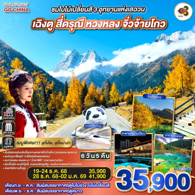 เฉิง เฉิงตู – อุทยานภูเขาสี่ดรุณี – อุทยานซวงเฉียวโกว (รวมรถอุทยาน) จิ่วจ้ายโกว – นั่งรถไฟความเร็วสูง – เฉิงตู – Chengdu Eastern Memory – ถนนคนเดินซอยกว้างแคบ – ชมแสงสียามค่ำคืนที่ลานห้างสรรพสินค้า SKP อำเภอสี่ดรุณี – ผ่านชมทะเลสาบเตี๋ยซีไห่ – เมืองโบราณซงพาน – จิ่วจ้ายโกว