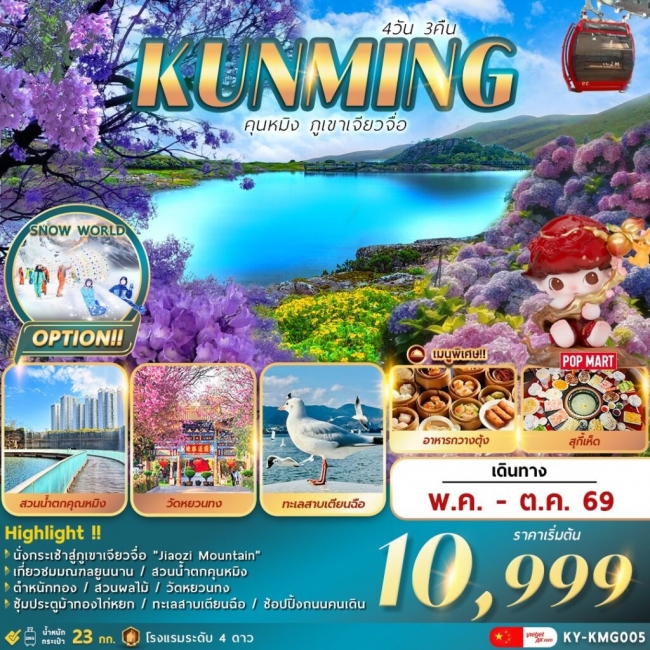 | 3 | ภูเขาเจียวจื่อ (นั่งกระเช้า+รถอุทยาน) – คุนหมิง – ร้านหยก – วัดหยวนทง – ประตูม้า ทอง ไก่ หยก – ช้อปปิ้งถนนคนเดิน – POP MART | / / |