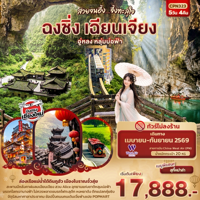 ทัวร์จีน ฉงชิ่ง เฉียนเจียง อู่หลง เขานางฟ้า หลุมบ่อฟ้า 5วัน 4คืน (บินตรงเชียงใหม่)