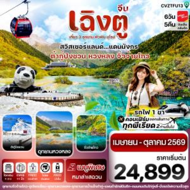 ซอยกว้างซอยแคบ-นั่งรถไฟไปสถานีหวงหลงจิ่วจ้าย เที่ยวอุทยานจิ่วจ้ายโกวทั้งวัน (รวมรถในอุทยาน+อาหารบุฟเฟต์)-ไปพักชวนจู่ซื่อ อุทยานฯหวงหลง(รวมกระเช้าขึ้นลง+รถแบตเตอรี่)-ไปทะเลสาบเต๋อซี-เข้าพักเต๋อซี จัตุรัสหย่างเทียนวู-แพนด้าเซลฟี่-กลับเฉิงตู-วัดต้าฉือ-แพนด้ายักษ์ปีนตึก- ถนนคนเดินไท่กู่หลี่ชุนซีลู่