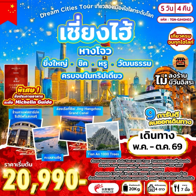| 4 | เซี่ยงไฮ้• หางโจว • ล่องเรือที่ Bei Jing-Hangzhou Grand Canal (มรดกโลก UNESCO) รับประทานเมนู Michelin Guide • ทะเลสาบซีหู • ถนนหูปิน • City balcony • outlet | / / |