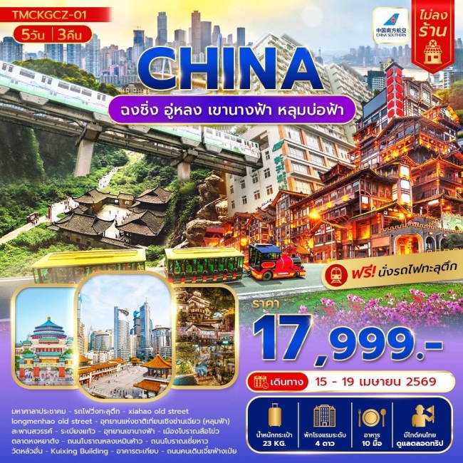 | 2 | กรุงเทพ(สนามบินสุวรรณภูมิ) - เมืองฉงชิ่ง - มหาศาลาประชาคม - รถไฟวิ่งทะลุตึก - xiahao old street - longmenhao old street CZ2362 BKK-CKG 00.30-05.00 | / / |