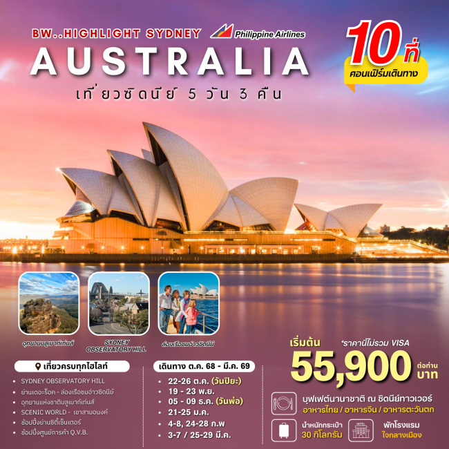 | 2 | ซิดนีย์ –ชมเมือง - Sydney Observatory hill -ย่านเดอะร๊อค – BRIDGECLIMP PYLONLOOKOUT & MUSEUM – ล่องเรือชมอ่าวซิดนีย์ | / / |