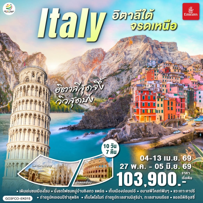 ดูไบ – โรม – วาติกัน - ถ่ายรูปโคลอสเซี่ยม โรม - เมืองปอมเปอี – เข้าชมเมืองโบราณปอมเปอี - โพสิตาโน - อมาลฟี่โคสท์ – ซอร์เรนโต- ล่องเรือ Hydrofoil สู่เกาะคาปรี -ชมถ้ำบลูกรอตโต - เนเปิลส์ - โรม – เซียน่า - ปิซ่า – ถ่ายรูปหอเอนปิซ่า – ลุกก้า - ลา สเปเซีย - นั่งรถไฟสู่หมู่บ้านชิงเกว – ปาร์มา – เวโรนา - หมู่บ้านซานตา แมดดาเลนา– บริกเซน – โบลซาโน - ขึ้นกระเช้าสู่ยอดแอลป์ดิซิอุสซี่ – ทะเลสาบคาเรซซา - ทะเลสาบมิสุริน่า - ทะเลสาบเบรียส - โบลซาโน- มิลาน - ถ่ายรูปมหาวิหารแห่งเมืองมิลาน - แกลเลอรี วิคเตอร์ เอ็มมานูเอล – โคโม – ถ่ายรูปทะเลสาบโคโม