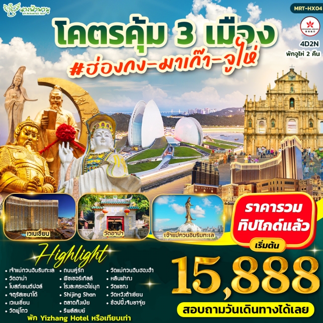 | 2 | ฮ่องกง – มาเก๊า – เจ้าแม่กวนอิมริมทะเล - วัดอาม่า – โบสถ์เซนต์ปอล์ - จัตุรัสเซนาโด้ - ร้านขนม - เวเนเชี่ยน – ปาริเซี่ยน – จูไห่ | / / |