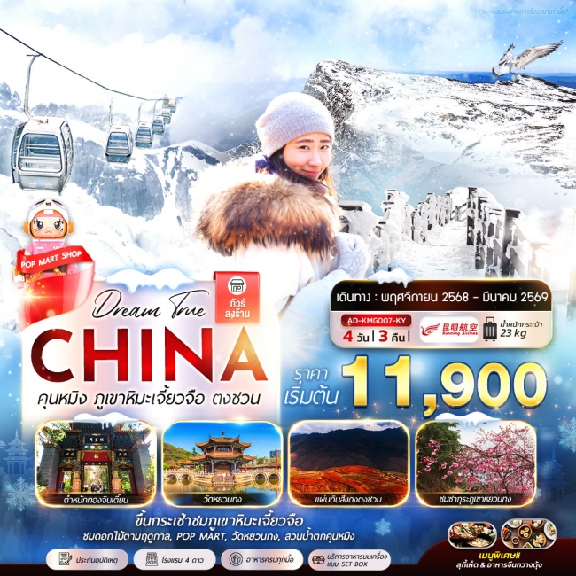 | 2 | เมืองตงชวนแผ่นดินสีแดง • ภูเขาหิมะเจี่ยวจือ (รวมรถ อุทยานและกระเช้าไป-กลับ) • เมืองคุนหมิง • ช้อปป้ิง ถนนเดิน, ประตูม้าทองไก่หยก, POP MART | / / |