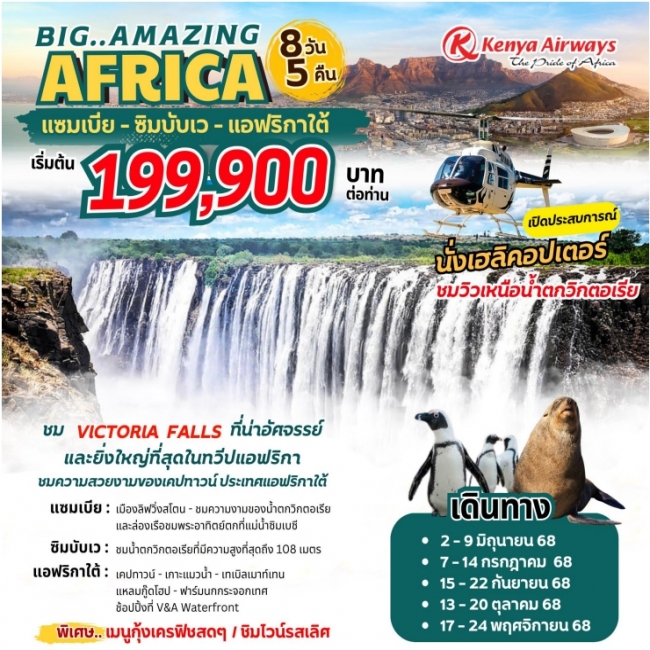 ทัวร์แอฟริกาเป็นอีกหนึ่งตัวเลือกที่น่าตื่นเต้นสำหรับนักท่องเที่ยวที่ต้องการสัมผัสประสบการณ์ใหม่ๆ ที่แตกต่างไปจากการเที่ยวทวีปอื่นๆ ในแอฟริกา คุณจะได้พบกับแหล่งท่องเที่ยวที่มีทั้งความงดงามทางธรรมชาติและวัฒนธรรมที่น่าสนใจ ไม่ว่าจะเป็นการท่องเที่ยวในอียิปต์ ที่จะพาคุณย้อนเวลาไปสู่ยุคโบราณ ชมมหาพีระมิดแห่งกีซ่าและสฟิงซ์อันยิ่งใหญ่ หรือการเดินทางสู่เคนยาเพื่อสัมผัสซาฟารีในอุทยานแห่งชาติเซเรนเกตี ชมสัตว์ป่าท่ามกลางธรรมชาติอันกว้างใหญ่แบบใกล้ชิด นอกจากนี้ ทัวร์โมร็อกโกยังนำคุณเข้าสู่โลกแห่งสีสันของตลาดมาร์ราเกชและสถาปัตยกรรมอันสวยงามของเมืองโบราณเฟซ